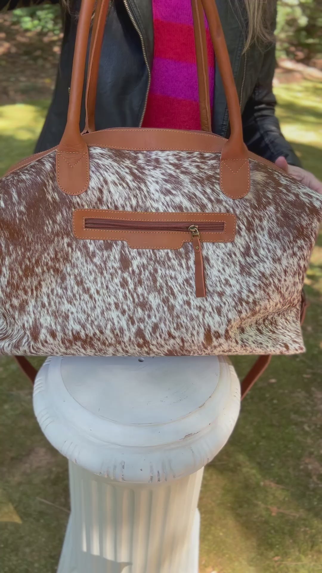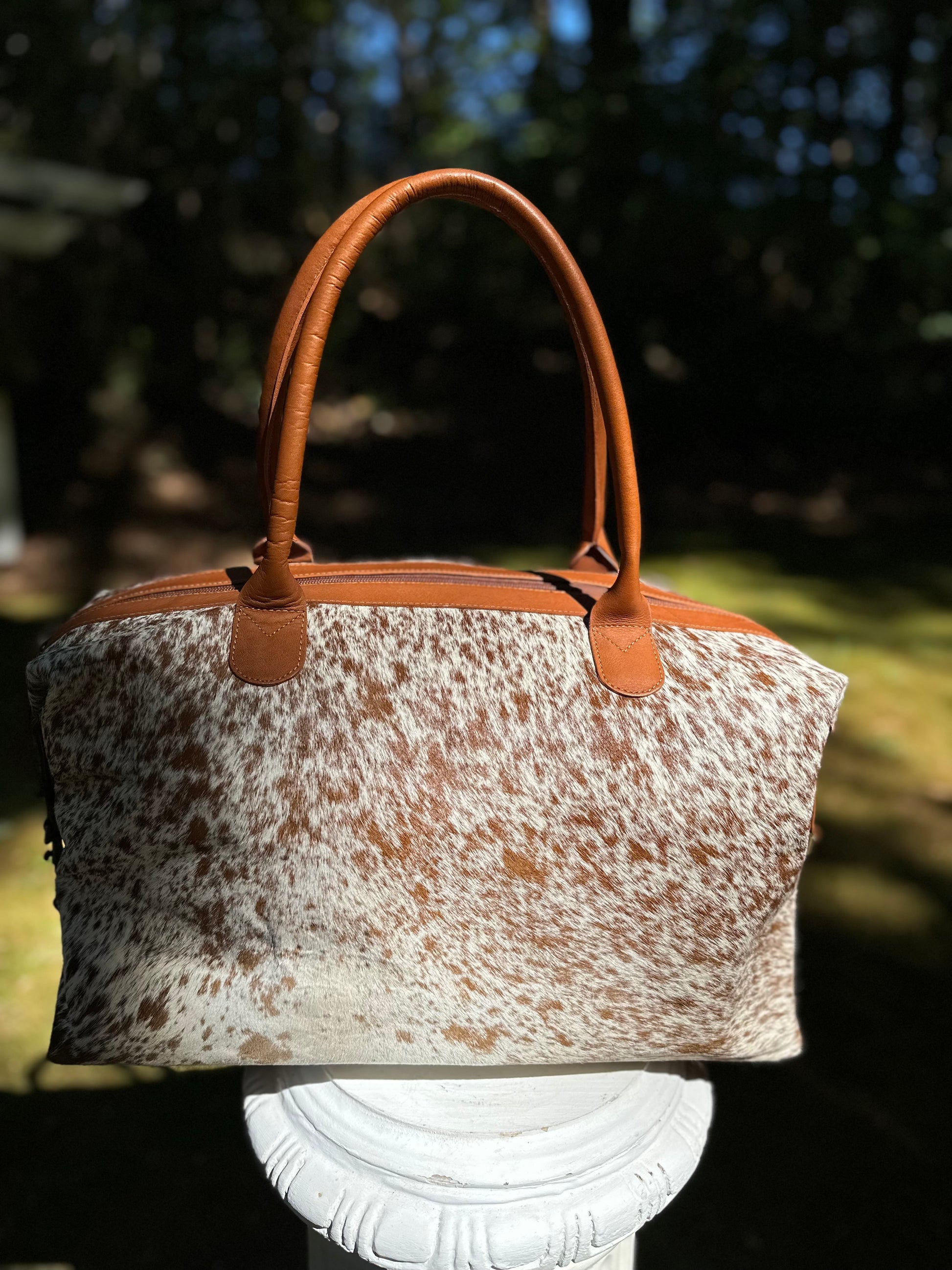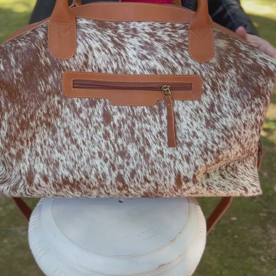 This timeless duffel bag is made with beautifully genuine Cowhide Hair on Skin and features NATURAL COW PRINT; other features include an outside pocket for easy accessibility to your essential items, a zipped pocket and 2 extra small pockets on the inside, and a detachable shoulder strap for comfort.